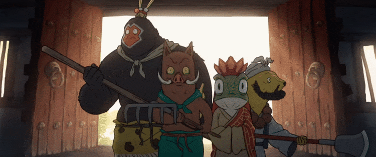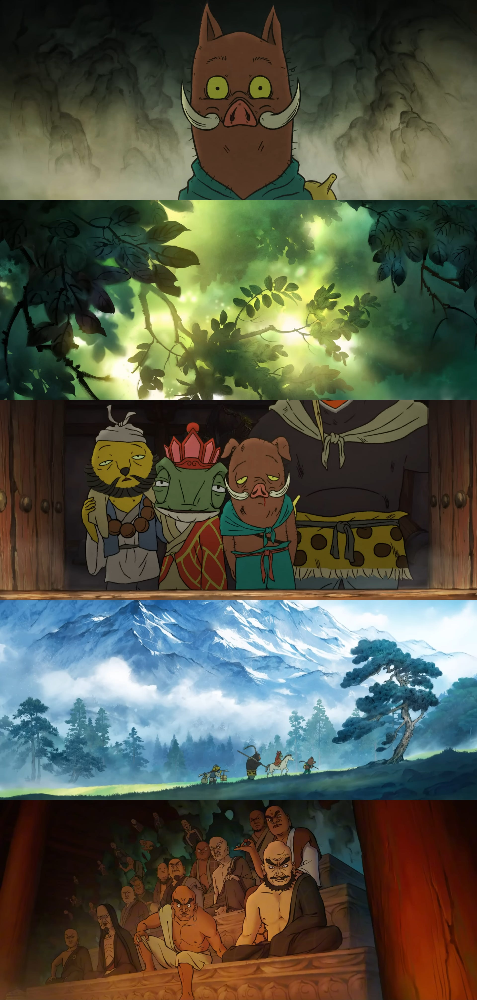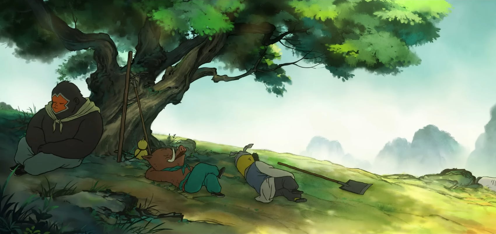 The short is likewise about a boar-creature who wants to become more than a lackey. And, visually, the whole thing is tied to Chinese tradition: ink-wash painting and local styles of cartooning come together on screen. The result was excellent, and people higher up thought it was ripe for a feature-length treatment.